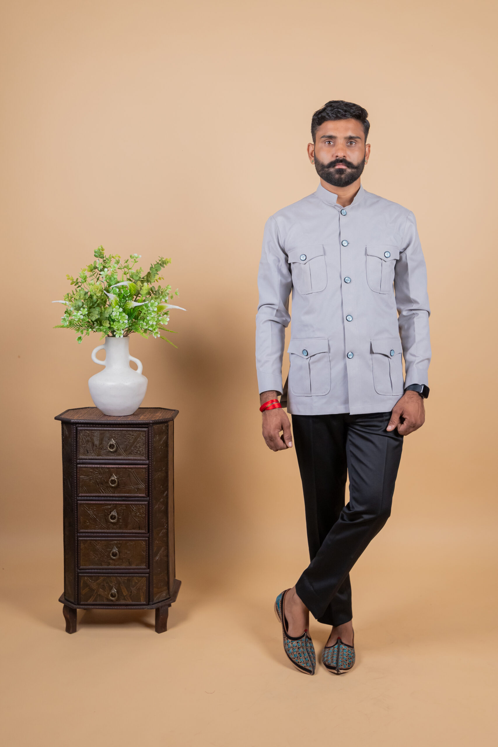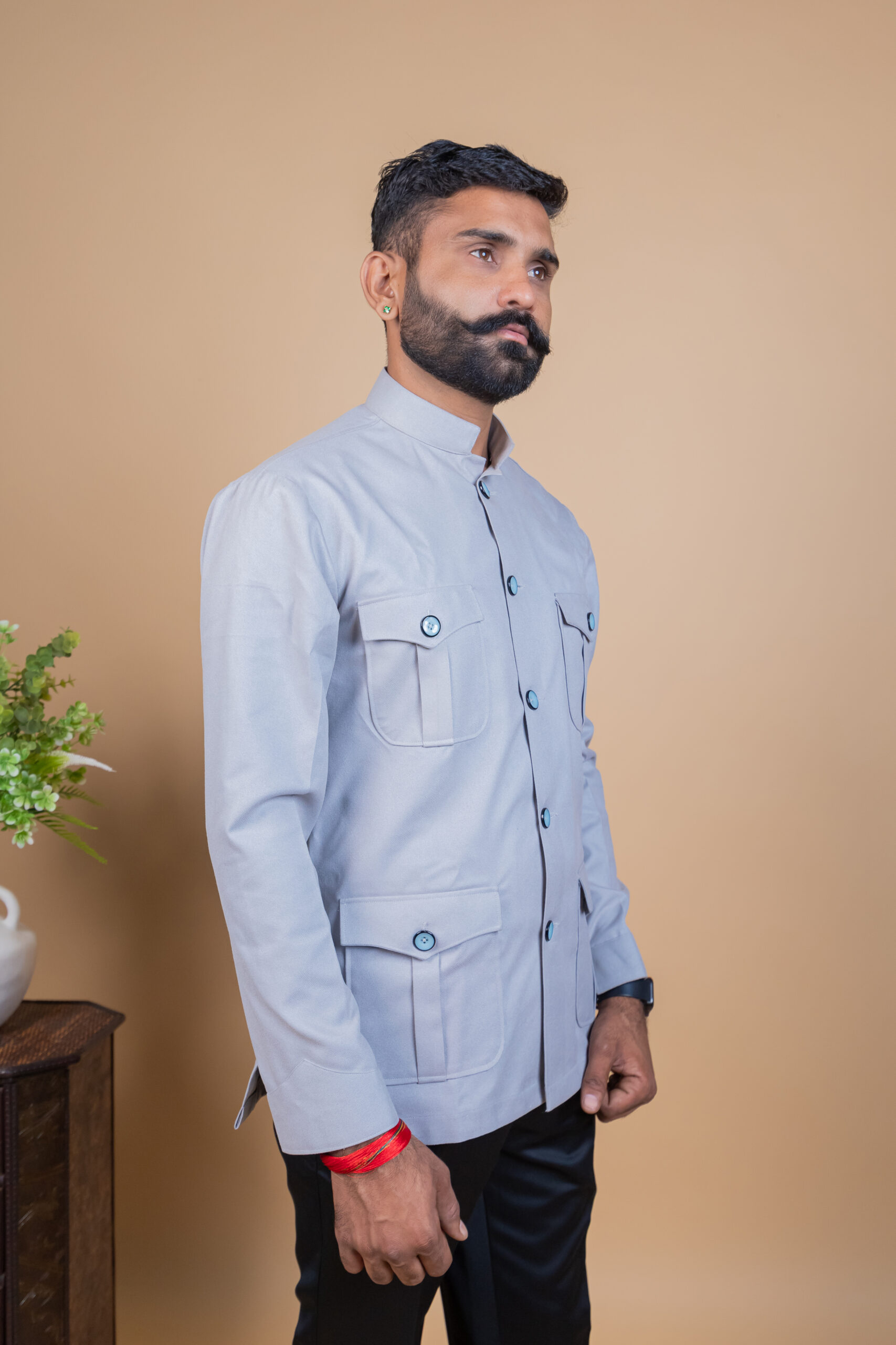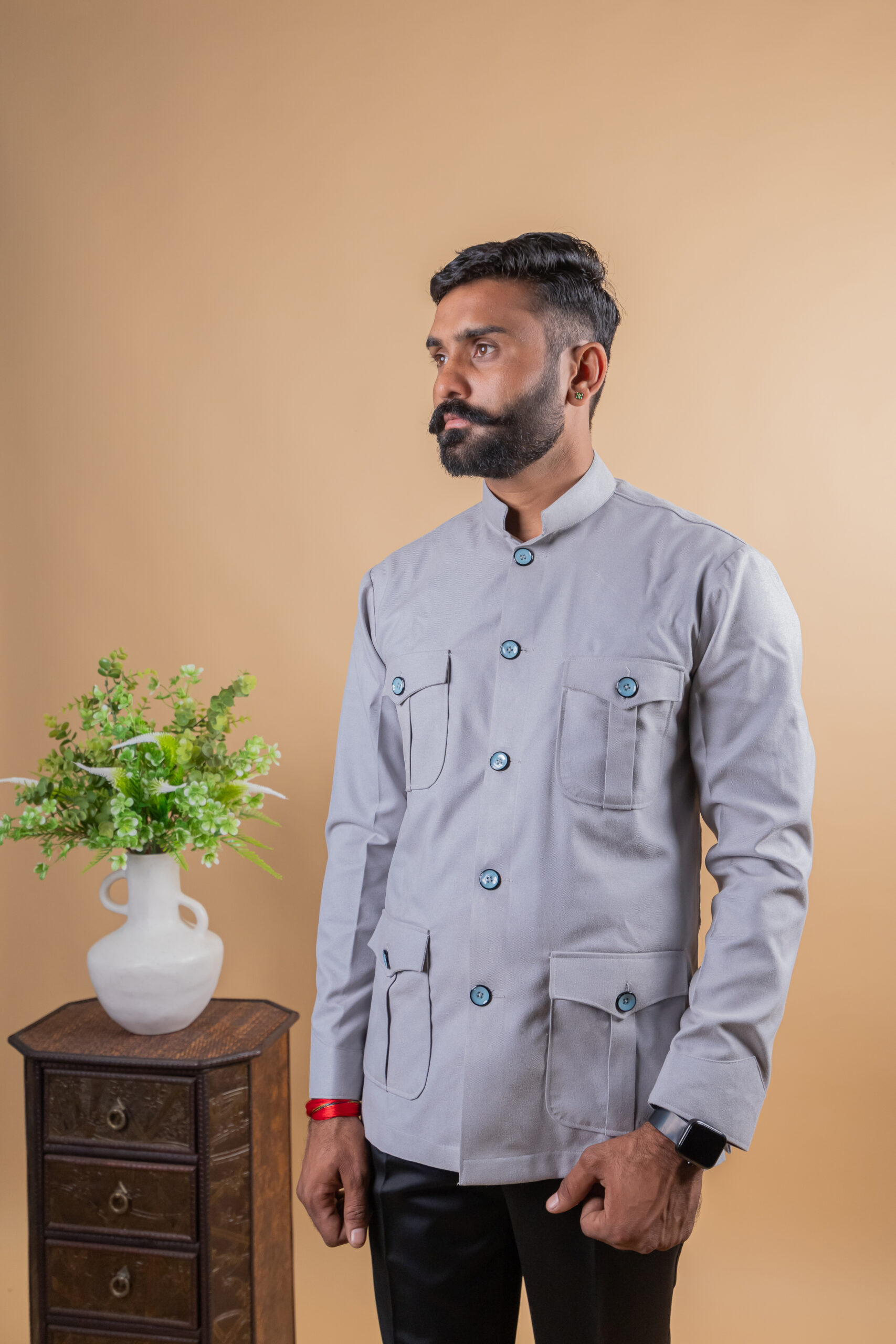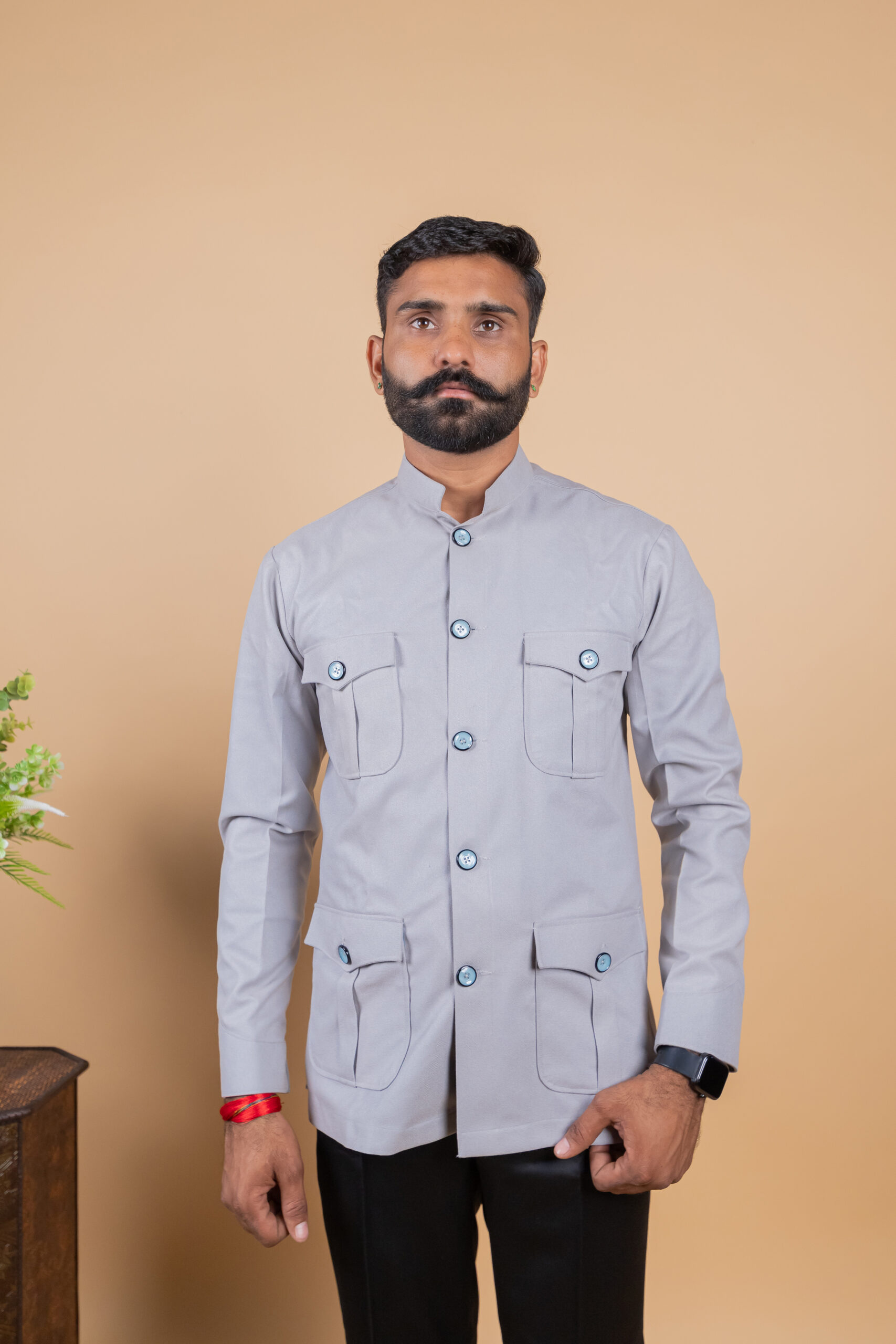 Inspired by classic Jodhpuri and Rajputana hunting attire, this shirt features a structured silhouette with a comfortable fit, making it ideal for long hours of wear. The light grey shade adds a modern sophistication while still keeping the traditional essence intact, making it perfect for heritage weddings, cultural events, festive occasions, and formal ethnic wear.