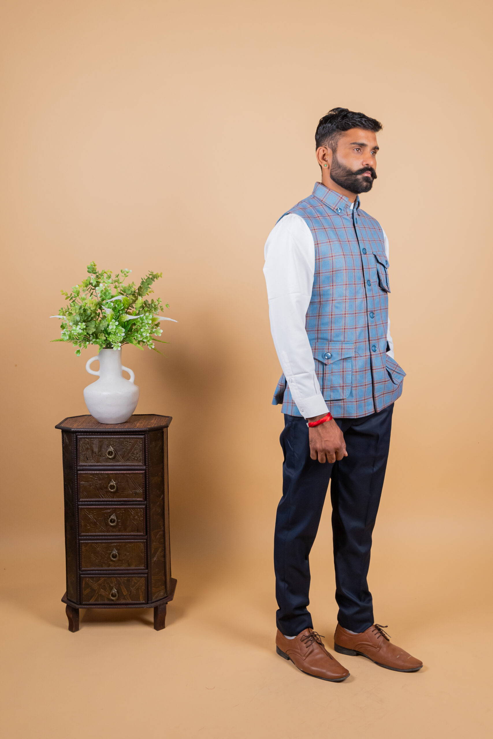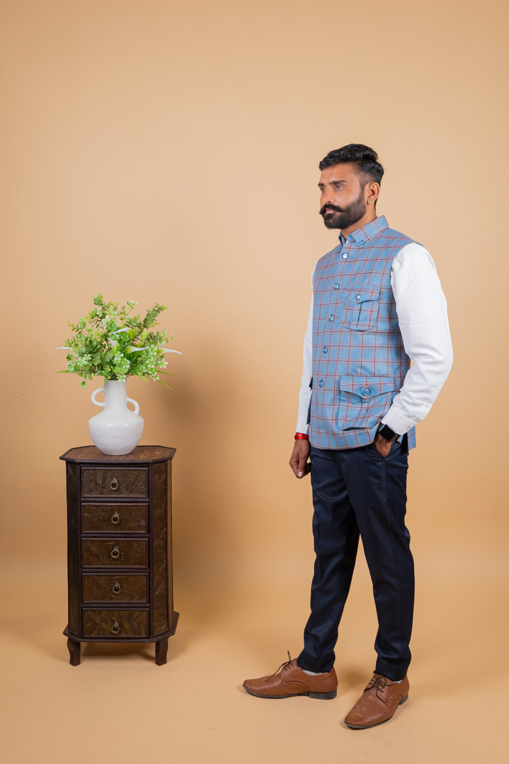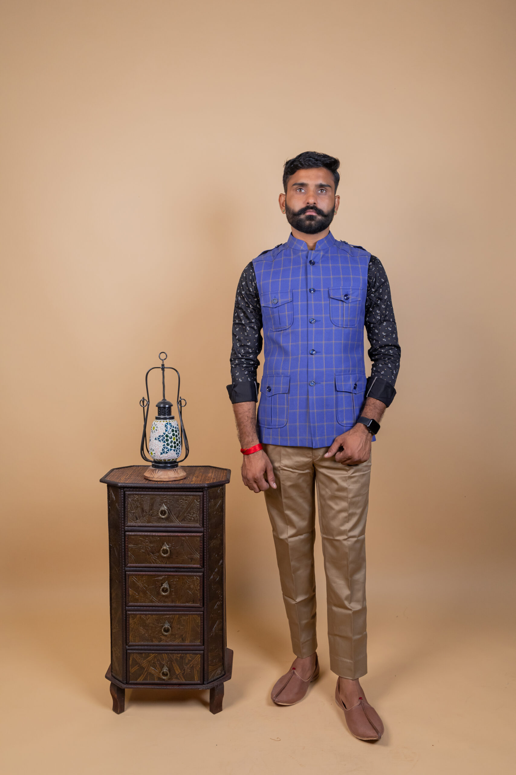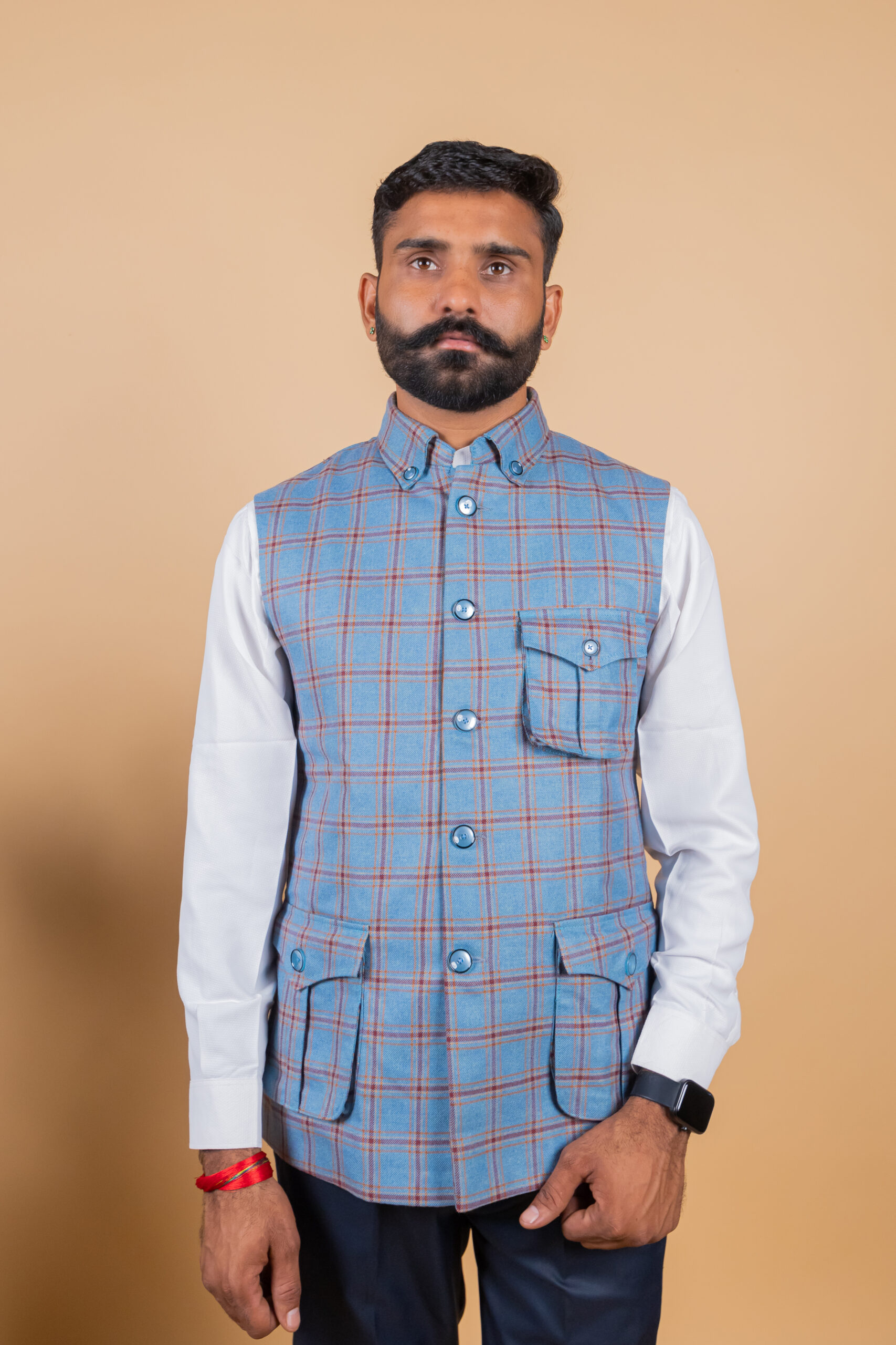 Add a touch of royal elegance to your wardrobe with this Men’s Blue Check Collared Rajputana Jacket, inspired by the timeless heritage of Rajasthan. Designed for modern men who appreciate traditional style, this jacket features a refined blue check pattern with a structured collared design, giving it a perfect blend of ethnic charm and contemporary appeal.